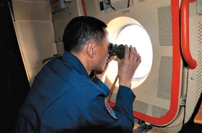 24日,中国空军机组人员在任务海域搜索。 新华社发