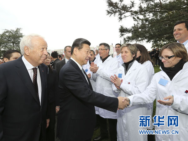 习近平和夫人彭丽媛抵达时,梅里埃集团总裁阿兰·梅里埃率家族成员以及该中心员工列队热烈欢迎。法国政府外长法比尤斯、高教部长菲奥拉索陪同参观。