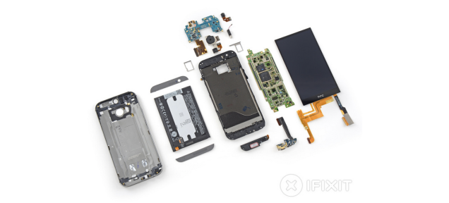 拆解成零件的过程中,取下后盖而不造成损伤是很难的。取下电池也非常困难,因为它藏在主板下面,而显示屏则是最难拆开的部分,压在所有组件的下面。机器内部大量使用胶布和胶水,iFixit给HTC One M8打出的可修复指数是2分,满分是10分。