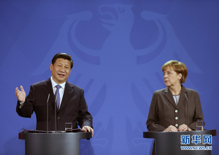 3月28日,国家主席习近平在柏林与德国总理默克尔共同会见记者。 新华社记者 兰红光 摄