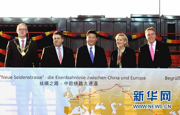 习近平表示,中方提出建设丝绸之路经济带倡议,秉承共同发展、共同繁荣的理念,联动亚欧两大市场,赋予古丝绸之路新的时代内涵,造福沿途各国人民。中德位于丝绸之路经济带两端,是亚欧两大经济体和增长极,也是渝新欧铁路的起点和终点。两国应该加强合作,推进丝绸之路经济带建设。杜伊斯堡港是世界最大内河港和欧洲重要交通物流枢纽,希望它能为促进中德、中欧合作发展发挥更大作用。