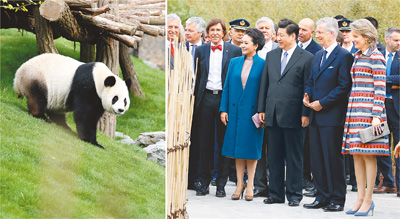 习近平和夫人彭丽媛抵达时,受到菲利普国王和玛蒂尔德王后、比利时首相迪吕波热情迎接。两国领导人一同步入中国园。亭台楼阁、雕梁画栋、鸟语花香,这里宛如一幅恬静祥和的中华写意画。两国元首夫妇沿着回廊曲径,穿过青翠竹林,前往大熊猫园。他们边走边谈,回顾中比两国友好交往。