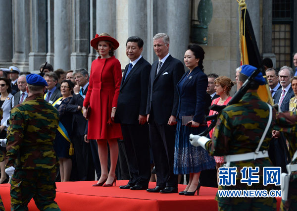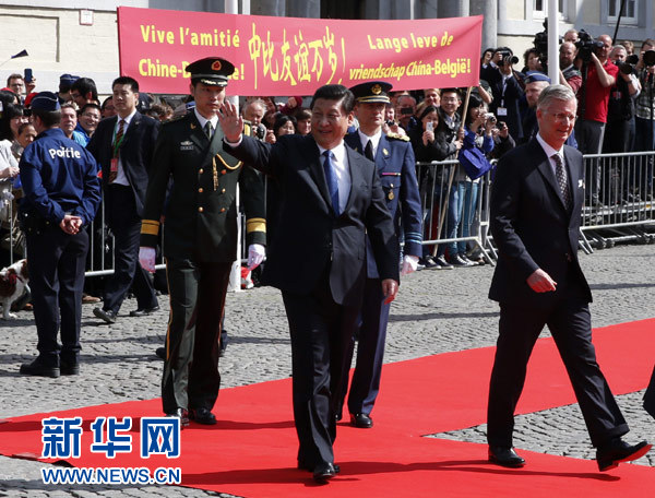 4月1日,国家主席习近平离开比利时布鲁日市启程回国。离开前,比利时国王菲利普在布鲁日广场为习近平举行隆重欢送仪式。 新华社记者马占成摄