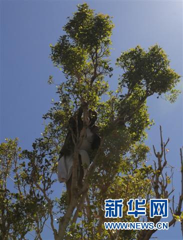 也门首都萨那郊区种植卡特树的农民爬上卡特树采摘树叶。记者刘万利摄影