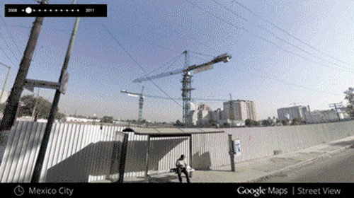 很明显,谷歌从2007年起就开始有意从大量数据中选择旧的街景快照。你只要看到左上角有一个小小的闹钟图标,点击就可以看到这儿近年来经过了怎样的变迁,至少是谷歌照片收集车眼里的变迁。