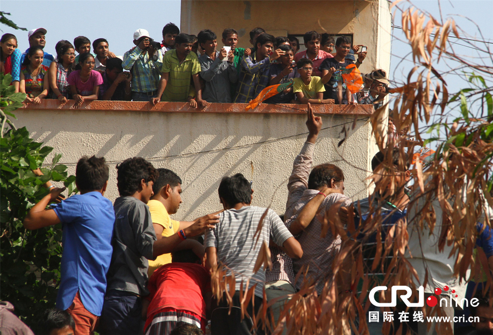 印度人民院选举第七阶段投票举行,印度人民党领袖莫迪现身古吉拉特邦首府艾哈迈达巴德,数千名莫迪的支持者把投票站周围挤得水泄不通,一些支持者站只好站在屋顶和墙上(摄影:何星宇)