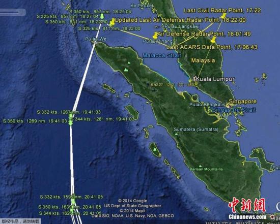 5月1日消息,马来西亚交通部通过路透社发布的地图展示了失联马航航班可能的飞行线路。马来西亚交通部1日发布了包含马航MH370飞机驾驶舱与吉隆坡空中管制中心的通话声音记录、马来西亚向国际民航组织4月9日提交的《初步报告》、MH370在3月8日1点38分至6点14分的飞行路径图和飞行动作、航班货运清单、登机人员名单及座位号等信息。