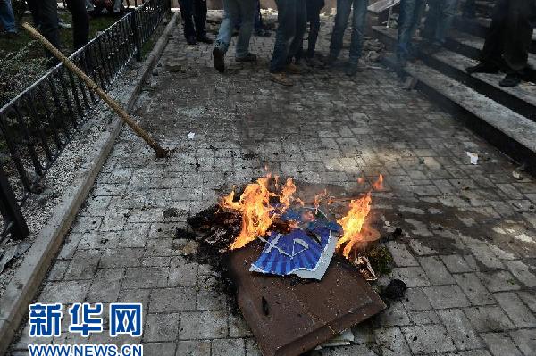 5月1日,在乌克兰顿涅茨克,亲俄民众在顿涅茨克州检察院大楼外焚毁检察院徽标。当日,乌克兰亲俄抗议者冲击并占领了东部地区顿涅茨克州检察院大楼。亲俄民众于4月初控制顿涅茨克州政府大楼并宣布成立“顿涅茨克人民共和国”,并定于5月11日举行全民公投决定该地区未来地位。新华社记者贾宇辰摄
