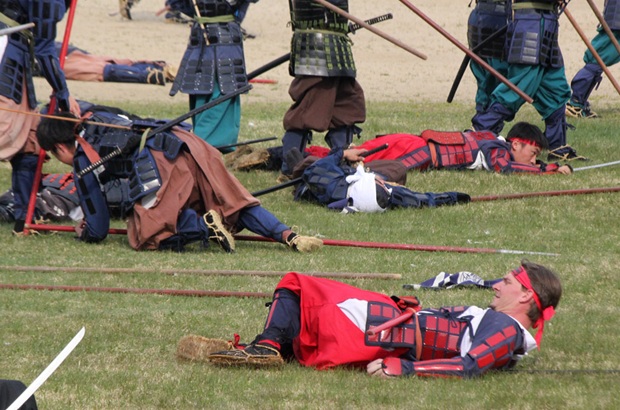 在仪式的战斗场面中,上杉谦信策马冲入敌军武田军阵营挥刀砍向武田信玄却被对方用发军令的团扇挡住的“三太刀七太刀”场面尤为精彩,获得了观众的热烈鼓掌叫好。