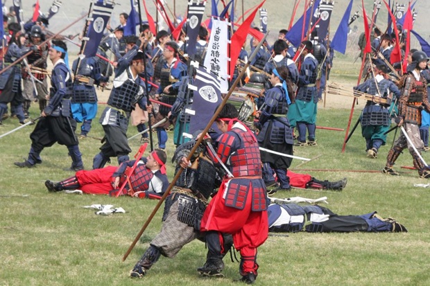 在“川中岛合战”仪式中,约800名身着甲胄的市民被分为黑衣的上杉军和红衣的武田军,双方在相隔约达10公里处集结列队站好。随后,伴随着火枪射击之声,摇着“毘”字和“龙”字样旗子的上杉军和摇着“风林火山”字样旗子的武田军在漫漫白烟中展开了激战。