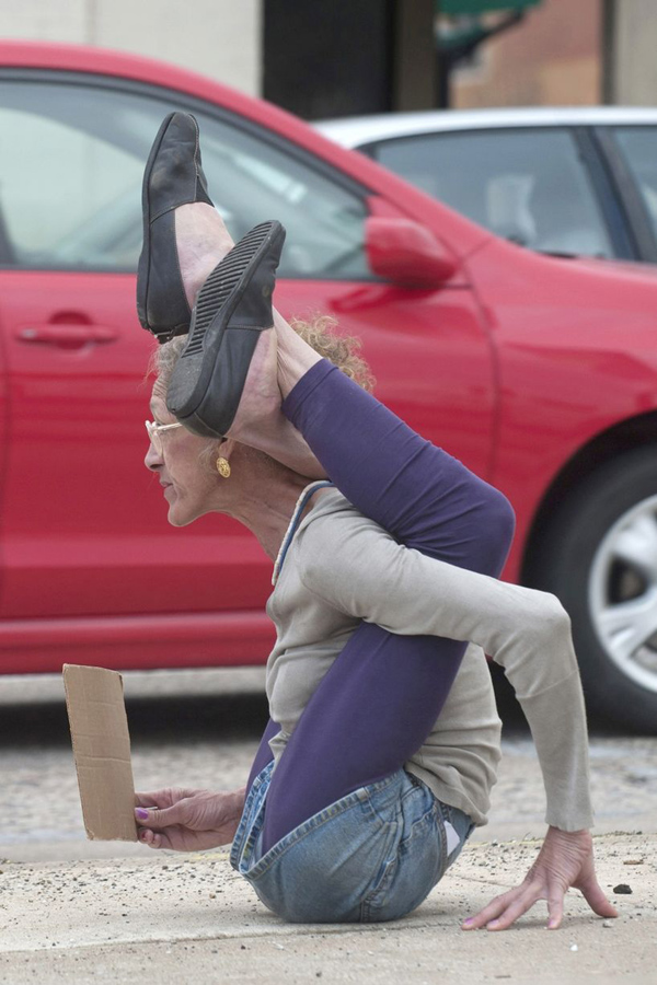 画面中,麦肯纳一边在街头表演着不可思议的柔韧术,一边乞求着路人的资助。她手里举着一个牌子,上面写道:我今年60岁,需要工作,请上帝和大家帮帮我。