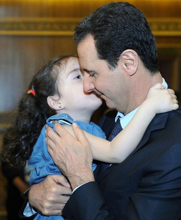小女孩拥抱叙利亚总统阿萨德。这是叙利亚总统官方Facebook页面上4月29日发布的一组照片。叙利亚总统巴沙尔 阿萨德(左)与夫人阿斯玛 阿萨德(右)29日接见了在内战中为政府而战失去亲人的民众。据报道,阿萨德已注册将于5月参加下任总统大选。