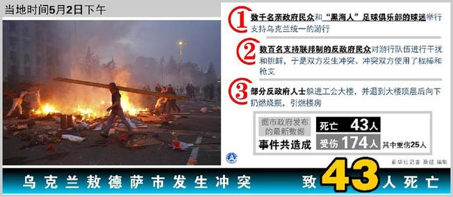 依据乌克兰政府部门发布的数据,在冲突和工会大楼的火灾中共有46人身亡,214人受伤,多人伤势严重。敖德萨市政府当天决定3日至5日为全市哀悼日。 >>>点击详细