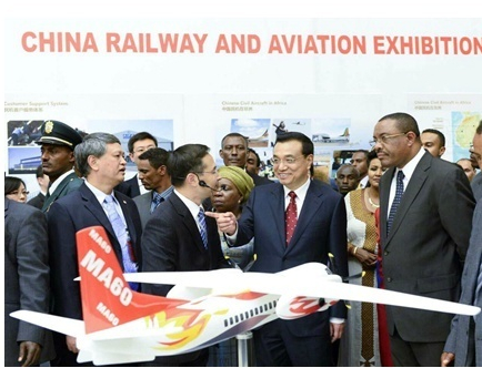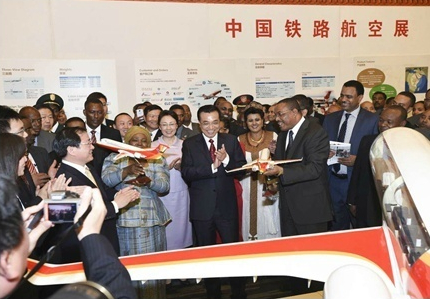 新华网北京5月6日电 据新华社“新国际”微博报道,中国铁路航空展5日在非盟会议中心举行,李克强总理及夫人程虹、埃塞俄比亚总理海尔马里亚姆夫妇、非盟委员会主席祖马等共同参观。李克强说,这些装备是中国自主研发,适合非洲国家需求,中国愿同非洲国家分享技术、培训、管理经验,帮助非洲实现世纪梦想。