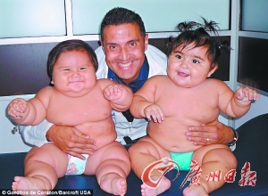 报道称,两个胖娃娃分别是山迪亚格和伊莎贝拉,两人都是小胖墩。山迪亚格的妈妈说,山迪亚格好像永远吃不饱,才8个月大的他,体重已经快要20公斤,这已经威胁到他的健康。
