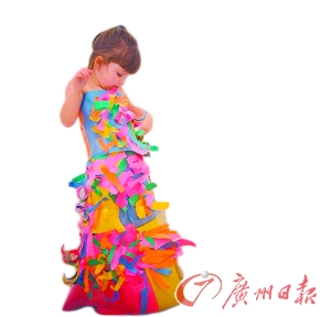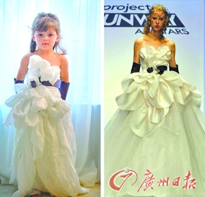 和“星二代”不一样的是,这个小姑娘穿的并非什么大牌或定制,而是和妈妈一起用纸做成的衣服。