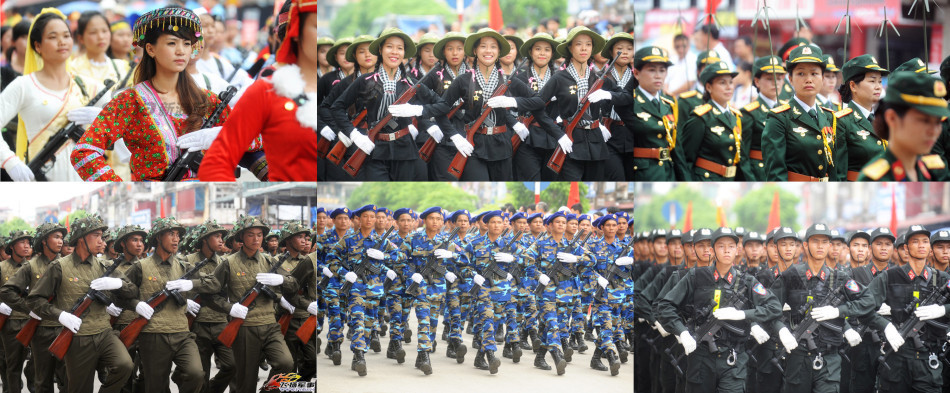 5月7日是越南奠边府战役胜利纪念日,在这一天越南将会举行阅兵式与游行活动。5月3日,越南进行了游行彩排。被网友拍下来。图中参与游行的越南军人使用的枪械五花八门,有老式苏制冲锋枪,也有美制M1、M18卡宾枪,还有从德制MP5系列冲锋枪。最引人注意的是多支女民兵方队。(来源:新浪军事)