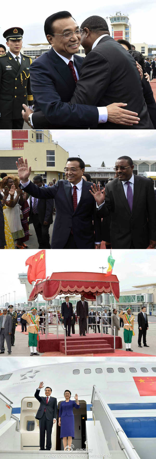 新华网北京5月7日电 据新华社“新国际”微博报道, 当地时间6日下午,李克强总理结束对埃塞俄比亚和非盟总部的访问,乘专机离开亚的斯亚贝巴飞赴此访非洲的第二站尼日利亚。埃塞总理海尔马里亚姆和夫人到机场欢送,并举行了欢送仪式。身着民族服装的当地民众载歌载舞欢送中国贵宾。