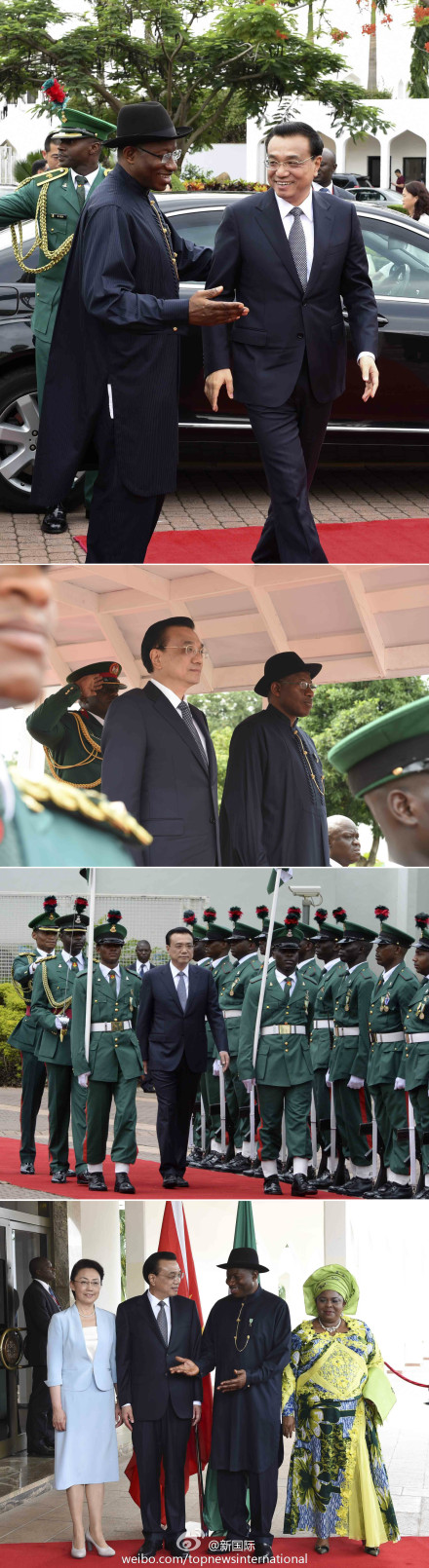 新华网北京5月7日电 据新华社“新国际”微博报道,当地时间7日上午,尼日利亚总统乔纳森在总统府为李克强总理举行隆重欢迎仪式,现场鸣响礼炮,军乐队奏两国国歌,李克强检阅了仪仗队。