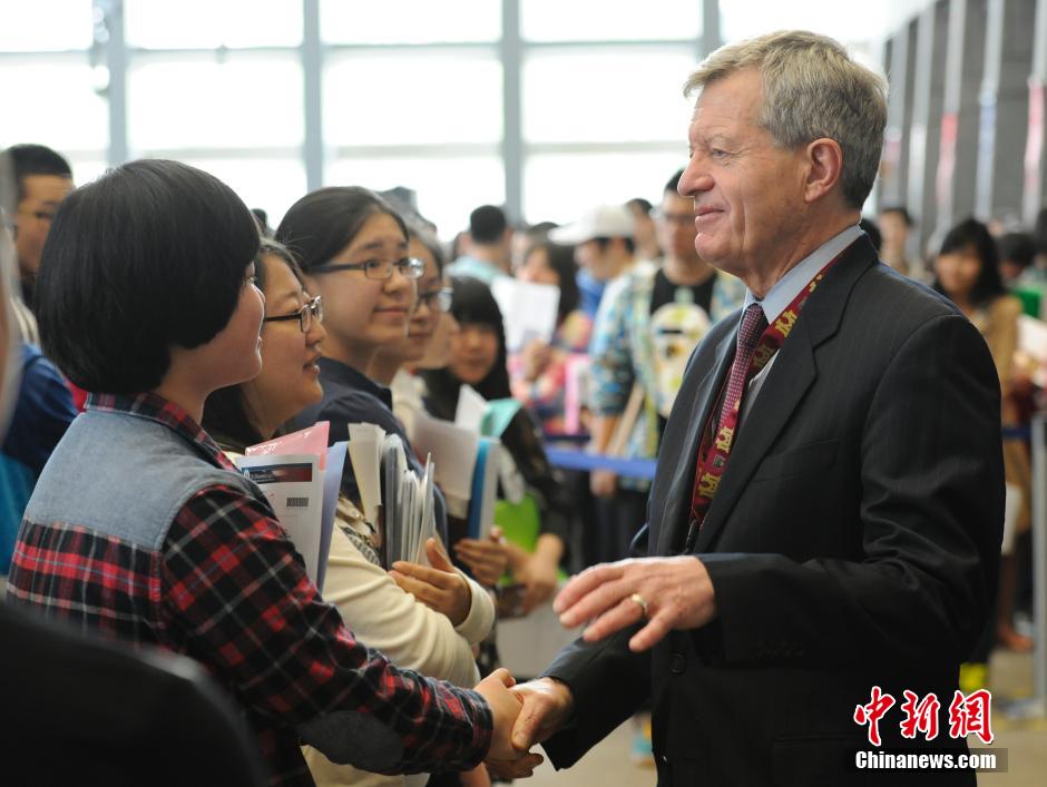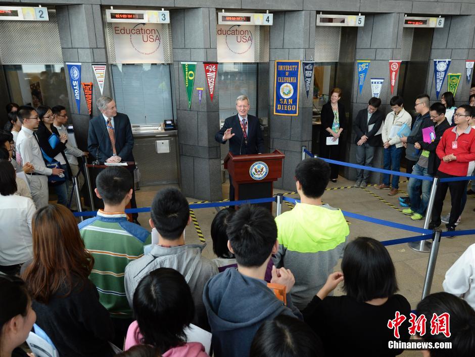 5月6日,美国驻华使馆在位于北京的领事处签证大厅举办学生签证日活动,美国驻华大使博卡斯来到现场,并发表讲话,向中国学生介绍留学美国之路。中新社发 侯宇 摄