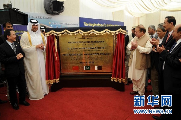 5月6日,在巴基斯坦卡拉奇,巴基斯坦总理谢里夫(右四)、中国驻巴基斯坦大使孙卫东(右二)及项目投资和建设主体中国电力建设集团董事长范集湘(左一)等出席巴基斯坦加西姆港1320兆瓦火电项目奠基仪式。中巴经济走廊能源领域的首个项目——巴基斯坦加西姆港1320兆瓦火电项目奠基仪式6日在巴南部城市卡拉奇举行。新华社发(艾哈迈德·卡迈勒摄)