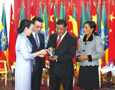 ▲李克强总理与夫人程虹当地时间6日上午同埃塞总统穆拉图夫妇在国家宫会见。会见后,程虹将自己的著作和译著赠送给姆拉图总统夫妇。图/中国政府网