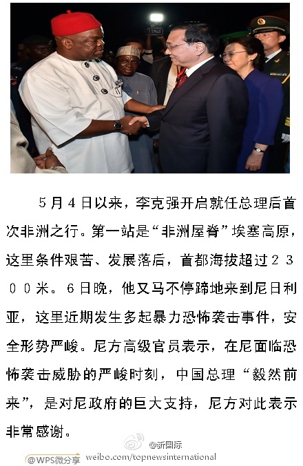 新华网北京5月7日电 据新华社“新国际”微博报道,5月4日,李克强开启就任总理后首次非洲之行。继首站访问条件艰苦、发展落后的“非洲屋脊”埃塞高原后,6日晚,他又马不停蹄地来到面临恐怖袭击威胁的尼日利亚。尼方高级官员表示,中国总理“毅然前来”,是对尼政府的巨大支持,尼方对此表示非常感谢。