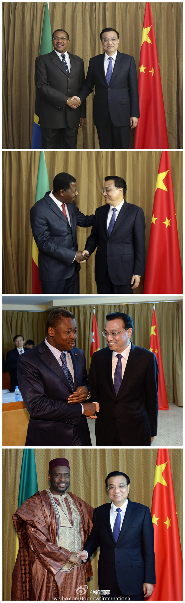 新华网北京5月8日电 据新华社“新国际”微博报道,李克强7日分别会见了出席第24届世界经济论坛非洲峰会的坦桑尼亚、贝宁、多哥三国总统和马里总理。会见中,四国领导人对李克强在非盟演讲中提出的中非“461”合作框架表示高度赞同,称其符合非洲人民的心愿,愿努力将其转化为实实在在的成果。