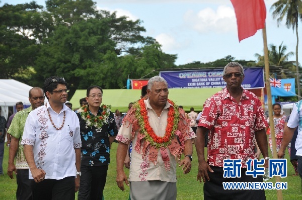 5月8日,在斐济楠德龙加-纳沃萨(Nadroga-Navosa)省锡加托卡(Sigatoka)峡谷,中国葛洲坝集团承建的锡加托卡峡谷公路项目正式竣工。斐济总理姆拜尼马拉马、中国驻斐济大使黄勇、中国葛洲坝集团股份有限公司副总经理邢德勇出席竣工仪式。图为姆拜尼马拉马(前排中)从竣工仪式现场前往剪彩地点。新华网 迈克 摄