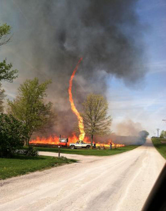 当时一位农民正在焚烧自家的农田,过程中出现了多彩的火焰龙卷风,快速旋转着耸入天际,这种自然现象也叫做“火焰漩涡”。开车经过的贾内看见后惊呆了,迅速用相机拍下这不可思议的时刻。贾内表示,大火在劲风的作用下形成了多彩的火焰与浓烟密布的乌云,这是她一生中经历的最酷的事。她在网上写道,“当时声音很大,温度也很高,我还有些害怕,不清楚它会不会移动,但是这一切只持续了几分钟。”