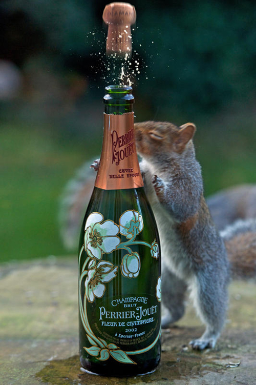 一只好奇的小松鼠被香槟突然弹起来的软木塞吓了个半死