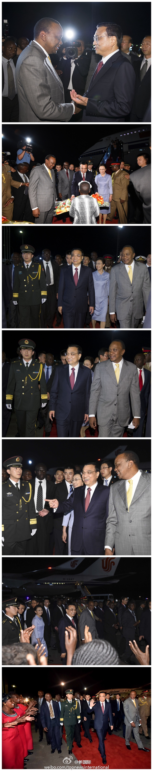 新华网北京5月10日电 据新华社“新国际”微博报道,李克强总理9日晚乘专机抵达内罗毕,肯尼亚总统肯雅塔和副总统鲁托率肯政府高级官员到机场迎接,当地民众以盛大的特色民族歌舞,欢迎中国贵宾到来。