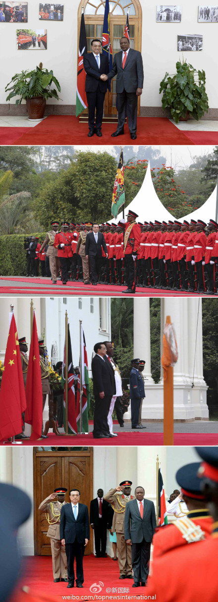 新华网北京5月10日电 据新华社“新国际”微博报道,肯尼亚总统肯雅塔10日上午在国家宫为中国总理李克强举行隆重欢迎仪式。现场鸣放礼炮,军乐队奏两国国歌。李克强检阅了仪仗队。