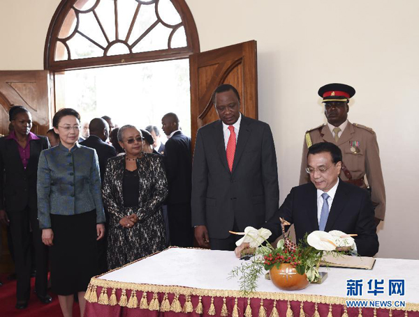 5月10日,中国国务院总理李克强在肯尼亚国家宫同肯总统肯雅塔举行会谈。这是会谈开始前,李克强在贵宾簿上签名。 新华社记者 李学仁 摄