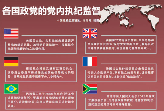 2008年全球金融危机以来,发展中国家,特别是新兴经济体的执政党,纷纷强化党内纪律检查机构建设,健全党内法规,加大惩治腐败力度。巴西劳工党于2009年出台《劳工党道德和纪律条例》,强化全国道德纪律委员会的职能,要求对违反党纪的党员必须给予处分,若涉嫌犯罪,党组织和个人必须支持司法机关进行调查处理。越南共产党第十一届五中全会决定加强党中央对反腐败工作的直接领导,中央反腐败委员会主任由越共中央总书记担任,重点是加强顶层设计,解决党政机关负责人反腐败决心不足、惩治不严等问题。南非非洲人国民大会于2012年底成立廉政委员会,负责党内财产申报,治理党员干部贪污腐败问题以及捍卫党的核心价值观,凡是挑战党的权威、违背党的决议、违纪违法的党员可立即开除党籍。尼日利亚人民民主党学习中国经验,于2013年9月成立全国纪律委员会,加强党内纪律建设,保证党员廉洁从政。印度国大党于2013年底联合主要在野党通过1968年就列入立法计划的《公民监察法》,为建立独立的最高反腐败机构扫清了法律障碍,被印司法部长称为“具有里程碑式的历史意义”。