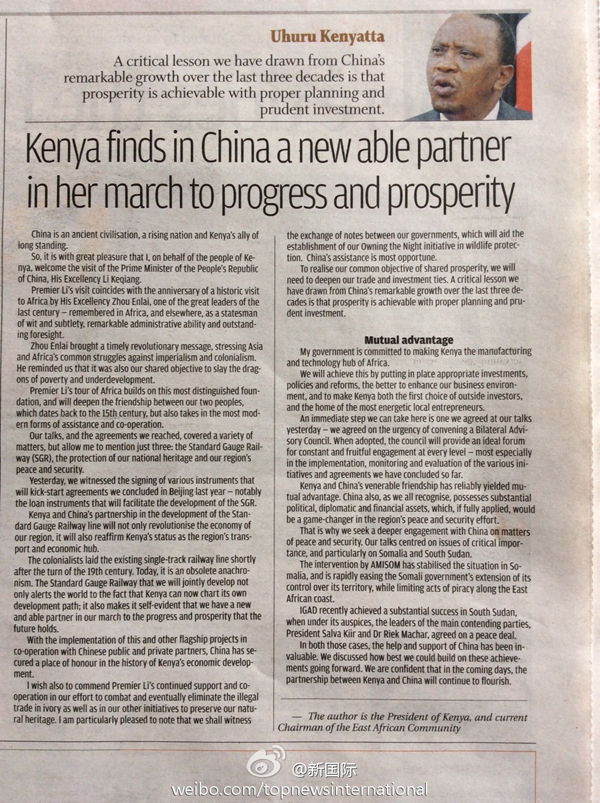 新华网北京5月11日电 据新华社“新国际”微博报道,肯尼亚《旗帜报》11日发表肯雅塔总统署名文章《肯将中国视为发展繁荣进程中的强力伙伴》。文章称,李克强此访将进一步加深传统友谊,推动双方新时期合作。随着多领域的良好合作,中国在肯经济社会发展中重要性与日俱增。肯方对肯中关系未来充满信心。