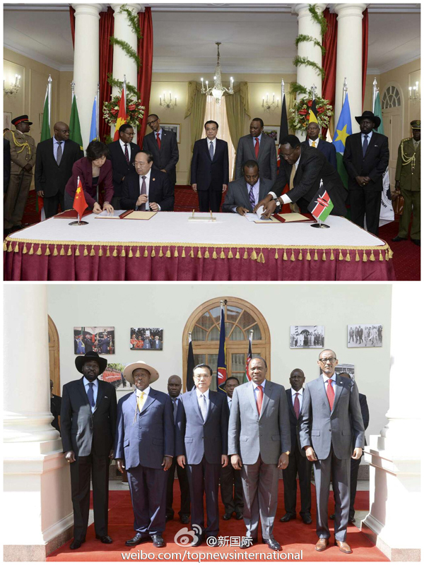 新华网北京5月11日电 据新华社“新国际”微博报道,李克强总理、肯雅塔总统11日和东非其他五国总统或外长共同见证了中肯蒙巴萨-内罗毕铁路相关合作协议的签署。该铁路是肯尼亚百年来建设的首条铁路,将把中国的资金、技术、标准、装备制造和管理经验带入非洲,为李克强此访倡议的非洲“三大网络”中的铁路网建设再添动力。