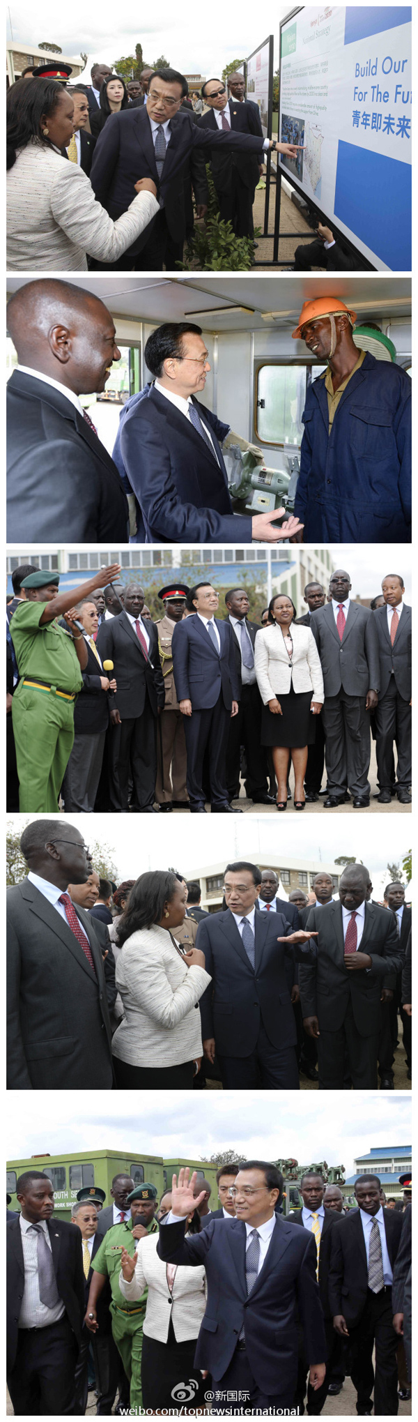 新华网北京5月11日电 据新华社“新国际”微博报道,李克强总理11日在肯副总统鲁托陪同下到国家青年服务队参观。这里供学员实习的钻井、起重、消防等装备不少来自中国。李克强攀上一辆移动维修车查看并询问维护等服务情况。他说,要用好中国装备和技术优势,帮助非洲青年提升职业技能,促进当地就业。