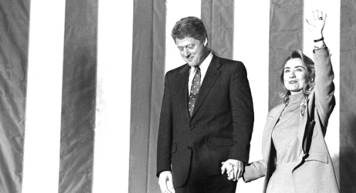 1992年3月,入主白宫不久的克林顿夫妻向支持者致敬。