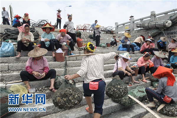 5月11日,在福建泉州丰泽区东海街道蟳埔社区文兴码头,勤劳的蟳埔女们在处理刚收获的牡蛎。 新华社记者 姜克红 摄