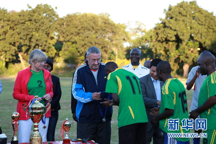 赞比亚副总统盖伊·斯科特(左二)和中国驻赞比亚大使周欲晓为获胜球队颁奖。