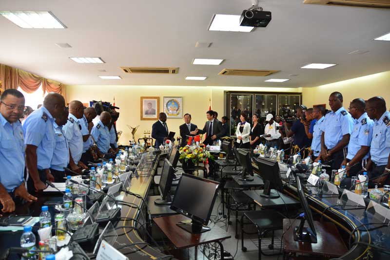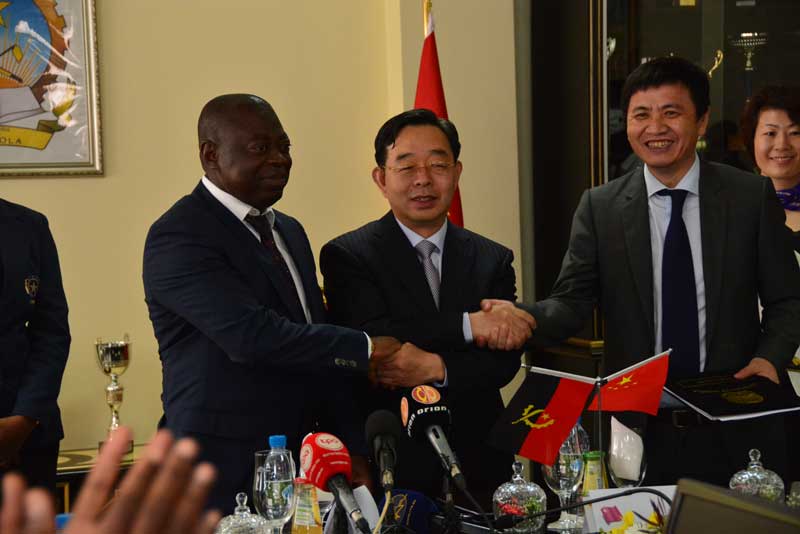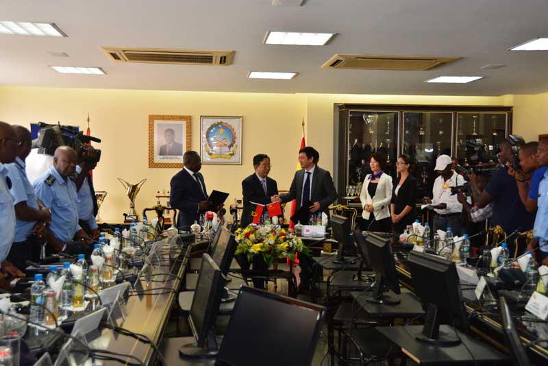 【环球网综合报道】2014年5月9日罗安达时间上午9时30分,中国北京海山控股集团有限公司董事局主席郑纲先生、中非发展基金有限公司总裁迟建新先生、安哥拉警察社保基金董事会主席路易斯亚历山大先生在安哥拉国家警察总司令部举行安中国际物流商贸园区签约仪式。安哥拉国家警察总司令安布罗休桑多斯以及警察总司令部核心领导共20多位将军共同见证了这一盛大签约仪式。