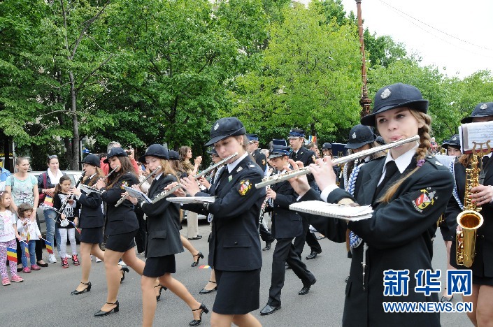 5月10日,罗马尼亚首都布加勒斯特举行的铜管乐队节开幕式。来自保加利亚、克罗地亚、法国、意大利、英国、荷兰、马耳他、波兰、瑞士、苏格兰、西班牙、土耳其以及东道国罗马尼亚的20支铜管乐队聚集首都布加勒斯特,参加由布加勒斯特市政府主办的铜管乐队节,作为庆祝“欧洲日”系列活动之一。20支铜管乐队中午从市中心统一广场出发,沿统一大道演奏进入议会宫前宪法广场,吸引众多市民观看。(记者林惠芬 摄)