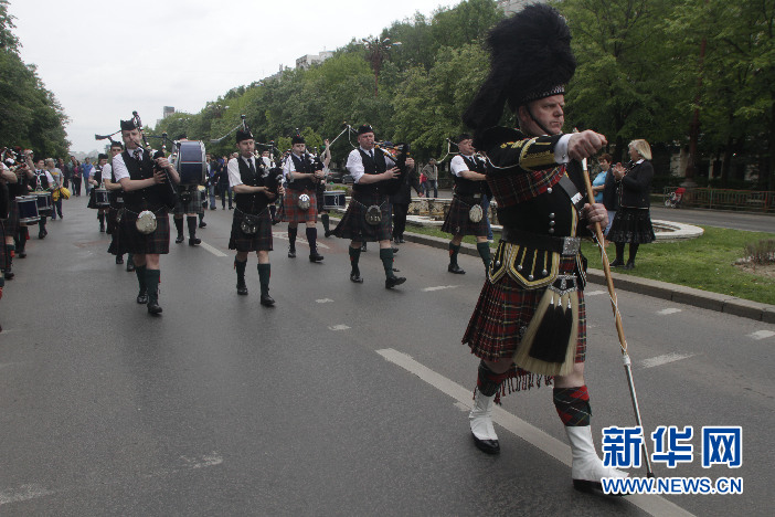 5月10日,来自保加利亚、克罗地亚、法国、意大利、英国、荷兰、马耳他、波兰、瑞士、苏格兰、西班牙、土耳其以及东道国罗马尼亚的20支铜管乐队聚集首都布加勒斯特,参加由布加勒斯特市政府主办的铜管乐队节,作为庆祝“欧洲日”系列活动之一。20支铜管乐队中午从市中心统一广场出发,沿统一大道演奏进入议会宫前宪法广场,吸引众多市民观看。(佩特雷斯库 摄)