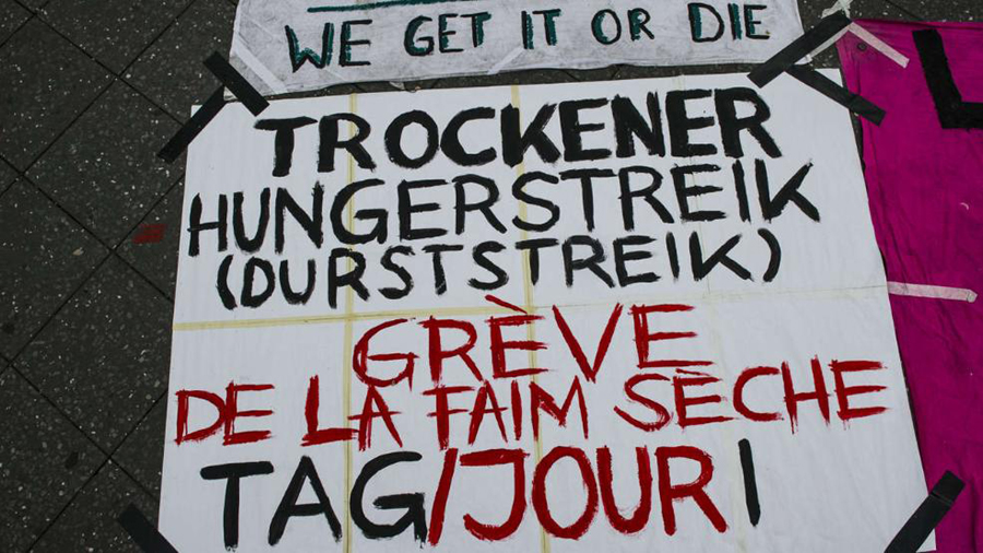 难民的标语牌上写着他们绝食抗议的决心。