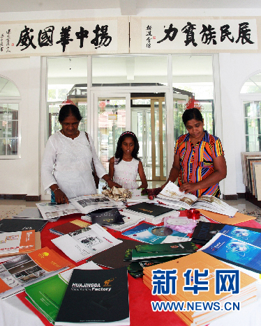 两名当地消费者带着孩子观看竣工仪式上展示的兴利嘉塑胶科技有限公司产品介绍。记者黄海敏 摄