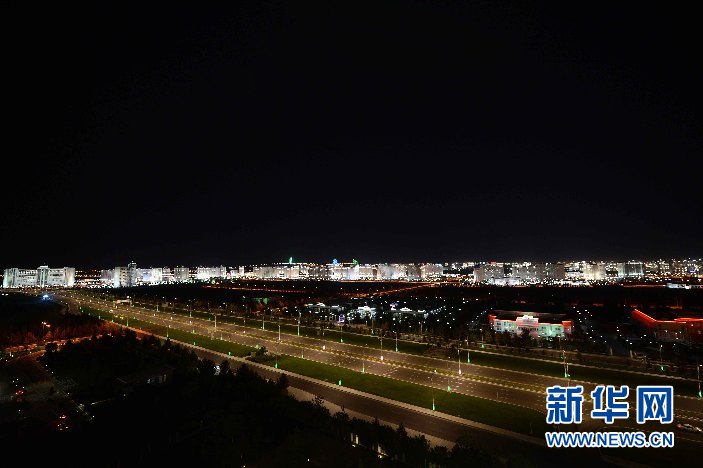 土库曼斯坦首都阿什哈巴德夜景,灯火通明美不胜收。晚上,阿什哈巴德的灯光就打开了,所有建筑都被五光十色的灯光照亮。记者沙达提 摄