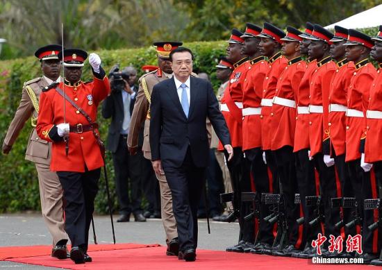 5月10日,中国国务院总理李克强在肯尼亚总统府广场出席肯总统肯雅塔举行的欢迎仪式。中新社发 刘震 摄
