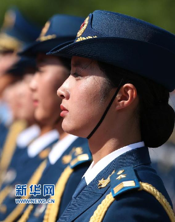 5月12日,我军首批三军女子仪仗兵亮相外交礼仪,接受中外领导人检阅。身着07式礼宾服的13名仪仗队女兵分列在军旗组和陆军、海军和空军军种之中,与男仪仗兵一起伴随检阅曲,手持礼宾枪接受检阅。 新华社记者庞兴雷 摄