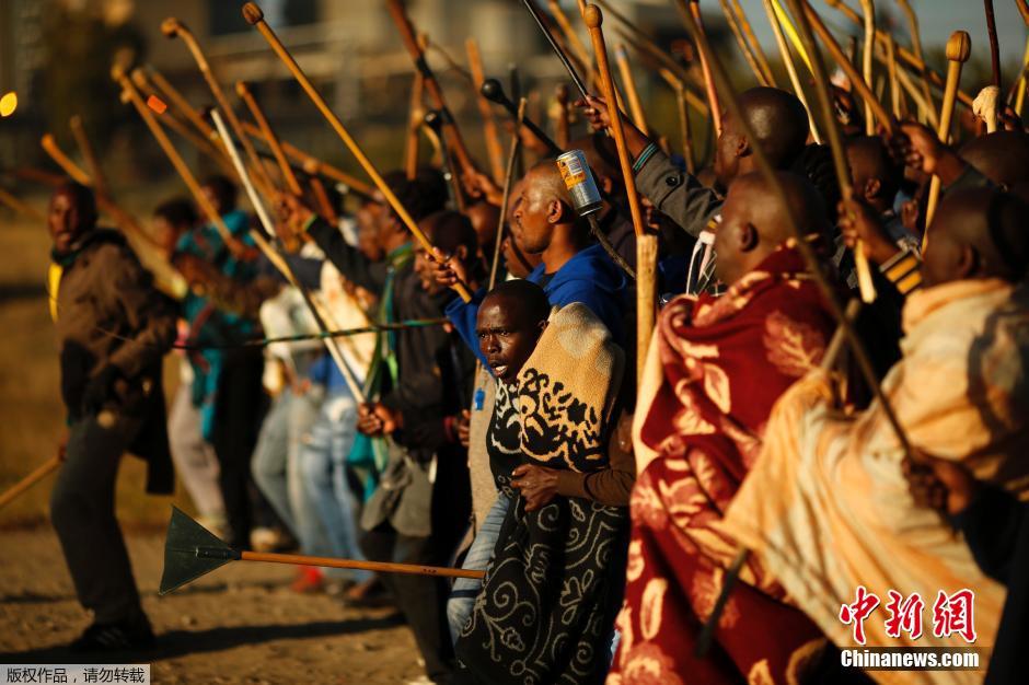 当地时间5月14日,南非勒斯滕堡,1000多名矿工挥舞者棍子在南非铂矿前罢工示威,并阻止企图进入工地工作的人员。